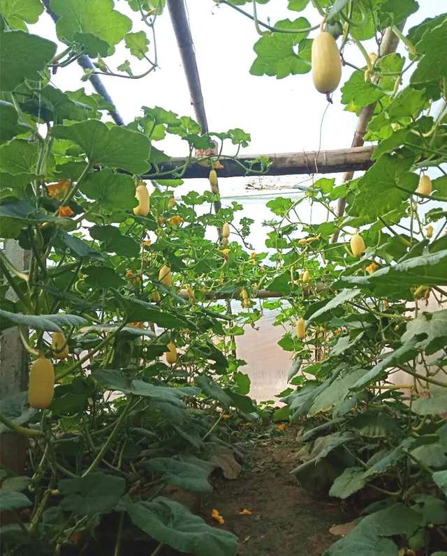 ▲“黃金筍瓜”掛滿棚架。