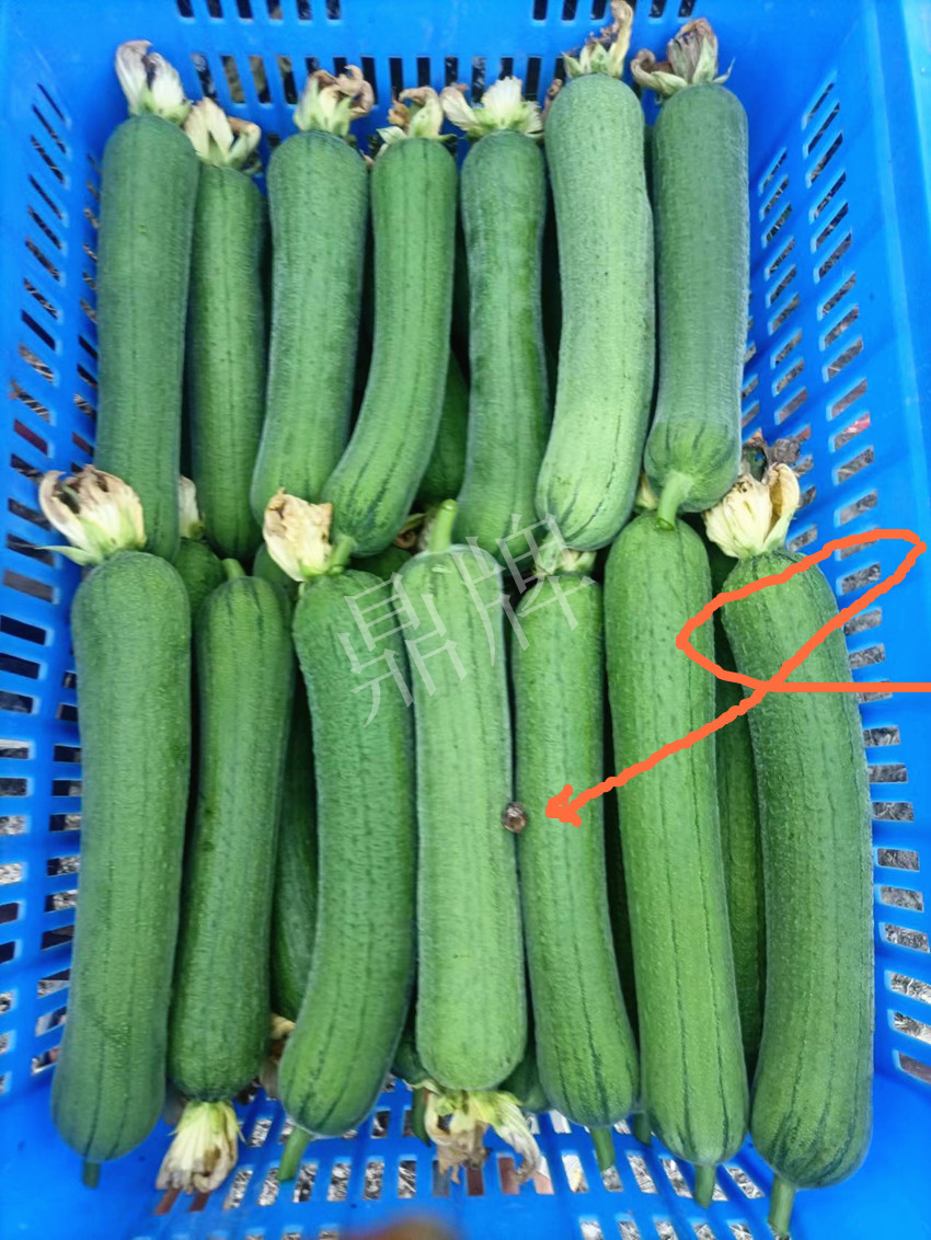 ▲ 裝入框中的“優(yōu)比1號”絲瓜。請看紅箭頭…