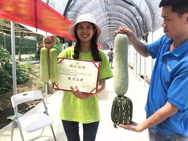 ▲ 客戶在展示“優(yōu)香1號(hào)”絲瓜,