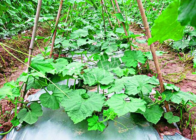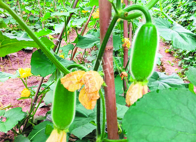 田間管理:去除所有側(cè)蔓,只留主蔓生長,為了減低坐果高度,主蔓向兩邊爬地后再上架,人字架交叉點離地面1.3米,便于果實膨大后自然垂落地面。